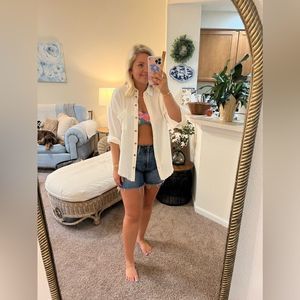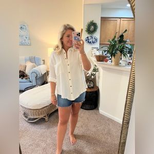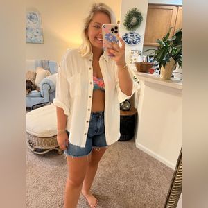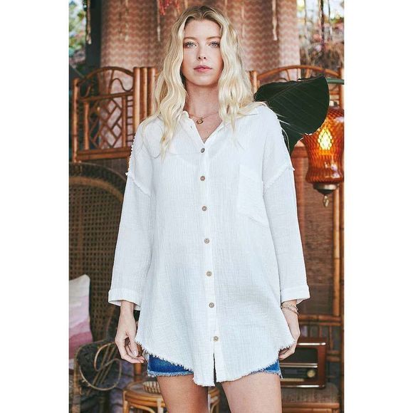 A new twist on an old classic! This raw edge white button-down is the perfect casual top or cover-up for your summer. Throw on over a one piece or pair with cut off shorts for a classic, 80s movie star look.