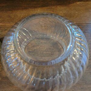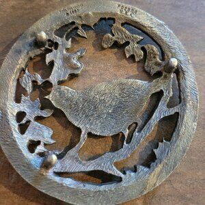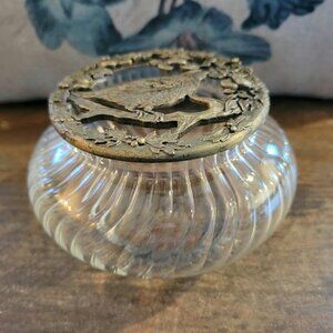 Rawcliffe Pewter Partridge in a Pear Tre over a Glass Potpourri or Trinket Jar. The pewter top has a cut out design of a bird sitting on a branch with small pears hanging down. Raised rim design of leaves and berries. The top is signed Rawcliffe Pewter, copy right sign, 1993, PC 2994, U.S.A. The pewter top is over a round ribbed glass bowl, raised rim & clear base. The item measures 2 3/4" high by 4 & 1/4 around the middle. The opening on top is 2 & 2/4" and the bottom is 2 & 1/4" around. In excellent condition.