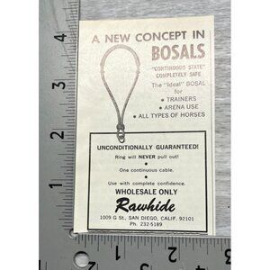 This charming vintage advertisement highlights a revolutionary bosal design, offering a "continuous state" of safety while accommodating trainers, all-purpose arena use, and various horse types. Uniquely crafted with a single continuous cable, it guarantees durability and reliability through its unbreakable ring feature. Proudly showcased by Rawhide in San Diego, California.