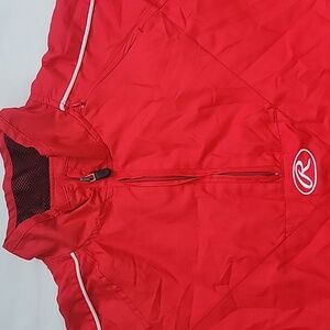 Vibrant red jacket by Rawlings. Made from 100% polyester. Features a classic design.