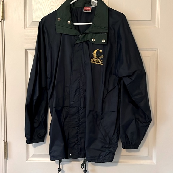 Blue and dark green Rawlings jacket size small says commotion promotions on the left chest. Rain jacket or wind, jacket, type material buttons, and zipper with two zipper pockets and drawstring at bottom. 30 inch length under arm length 22.