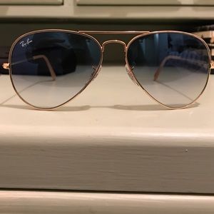 These are authentic Ray Ban RB3025 Aviator Gradient Blue Lens Gold Frame sunglasses. I've worn them a few times but honestly the blue color isn't my style. Comes with case, cleaning cloth still in plastic and Ray Ban book.