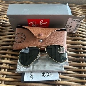 Brand new with original box, cleaning cloth. Aviators with gold rim and green lenses.