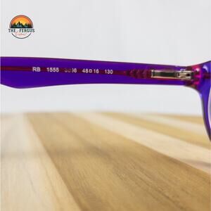 Ray-Ban RB1555 3666 kids/girls purple and pink oval eyeglasses frame, size 46-16-125. These glasses feature a fun, retro-inspired colorway with a vibrant purple and pink gradient. Perfect for adding a playful touch to any kid's style. Excellent used condition, minor wear.
