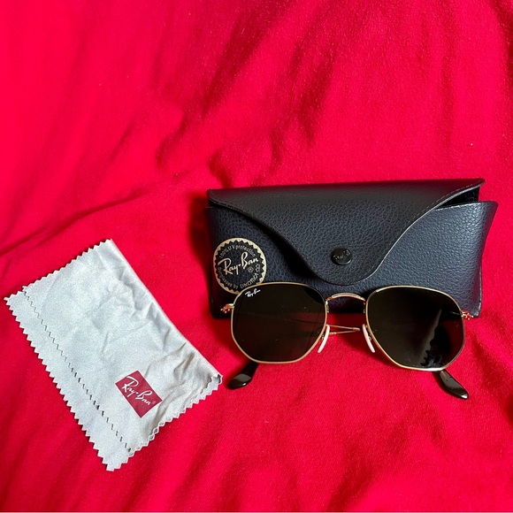 These are authentic Ray Bans ‘Hexagonal’ anti-reflective sunglasses!!This hexagonal titanium metal shape features thin coined profiles on legend gold frames and temples. Experience the thrill of wearing an updated classic!!This pair of unique sunglasses includes carrying case and micro fabric cloth!! All items are sanitized/disinfected prior to exchange/shipping!! All listings are cross posted, so if interested act fast!! Reasonable offers accepted!! Check out our other listings for bundle discount opportunities!!