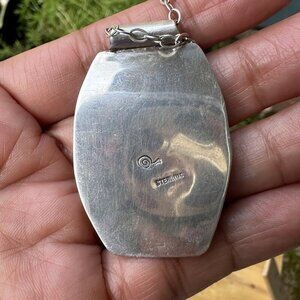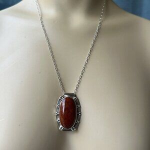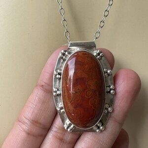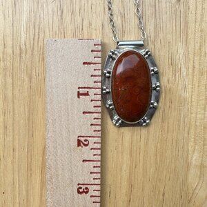 This unique necklace features a beautiful oval-shaped pendant made of sterling silver and adorned with gemstones. The pendant hangs from a 20-inch chain and is signed by the renowned lapidary artist Ray Youmans. The piece is crafted from gem dinosaur bone and showcases a stunning multicolor red orange and clear stone composed of jasper and agate minerals. The necklace is perfect for anyone who loves hand made American artisan jewelry and wants to add a touch of prehistoric charm to their wardrobe. It is a vintage piece, but it has been beautifully crafted and is sure to impress. The necklace weighs 25.0g and is made in the United States. See Photos and Video Clip for more information. The pendant is brand new never been worn that we acquired from a jewelry collector, it is in near mint condition with remnant tooling or handling marks by the artisan, the chain is pre owned in good condition with minor use wear and a properly functioning clasp.