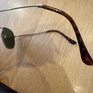 Elegant Ray-Ban sunglasses with a sleek gold frame. Dark lenses for a modern look.