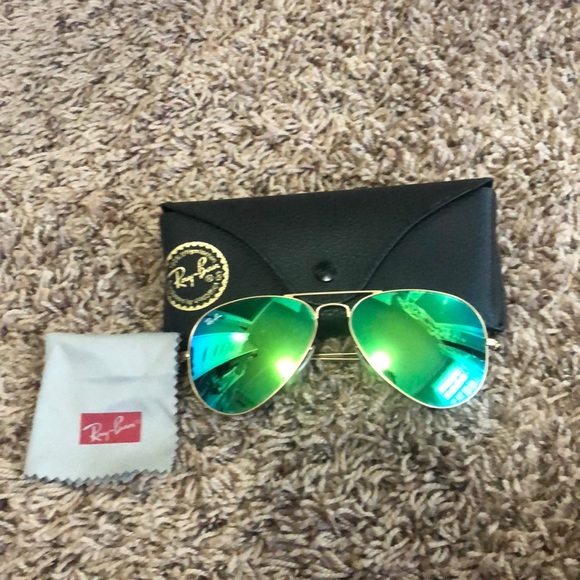 Gold frame with green lens. Like new, worn twice. Case and cleaning cloth included