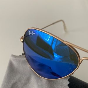 Near perfect condition. The slightest ware on frame, BARELY noticeable. Style RB3025 aviator, large metal 112/17. Mirror blue lens gold metal.