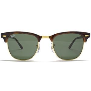 Practically brand new RAY-BAN CLUBMASTER CLASSIC sunglasses! The frames are Tortoise and Gold and the lenses are “Green”. This comes with a custom blue and white ombré Ray-Ban case and a Ray-Ban cleaning cloth. There are no scratches or dings whatsoever, could pass as brand new!
