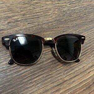 Own an absolute classic pair of sunglasses for a fraction of the price. Beautiful, vintage style Ray Bans clubmaster classic sunglasses in polished tortoise with gold details. Lenses appear to be G-15 green can't verify lens color 100%. Lightly used, no noticeable scratches or issues. Nose size indicator says 49 and 21 but nose pieces and screws all adjustable. Comes with case that appears in pictures.