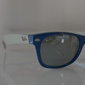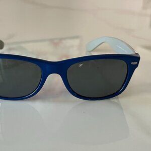 Classic and stylish Ray-Ban New Wayfarer sunglasses in the hard-to-find 801/40 colorway. Features a sleek blue plastic frame with modern gray temples for a clean, versatile look that works with any outfit!