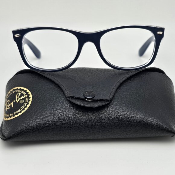 This listing is for authentic Ray-Ban RB2132 6053/71 New Wayfarer Color Mix Matte Blue on Crystal Clear Unisex Sunglasses Frame w/ Case Italy 52-18-145. Sunglasses frame is in good pre-owned condition, with light wear (see photos). Listed price is reflective of item condition. Size: 52-18-145. Made in Italy. Ray-Ban black soft case in poor condition included in listing. Please see pictures to make your complete condition assessment.