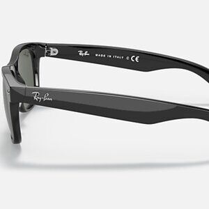 The Ray-Ban RB2132 New Wayfarer features a refined square silhouette with a lightweight nylon frame in polished black. Paired with iconic G-15 green solid-color lenses, this modern take on the classic Wayfarer delivers timeless style with standard face coverage and a comfortable high-bridge fit. A versatile unisex essential for everyday wear.