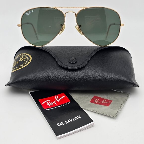This listing is for authentic Ray-Ban RB3025 001/58 Aviator Classic Polished Arista Gold Frame Polarized G-15 Green Glass Lens Unisex Aviator Sunglasses w/ Case Italy 58-14-135. Sunglasses are in poor/fair pre-owned condition, both lenses have scratches and frame has light wear (see photos). Listed price is reflective of item condition. Size: 58-14-135. Made in Italy. Ray-Ban black case, micro fiber cleaning cloth and info booklet include in listing. Please see pictures to make your complete condition assessment.