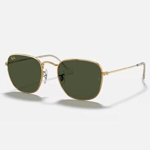 Ray-Ban Frank sunglasses are a classic metal square frame, designed with gold metal frames and classic green lenses that provide 100% UV protection. This unisex model features the iconic Ray-Ban G-15 lens treatment for a timeless look that never goes out of style. With its square shape and gold metal frames, these sunglasses offer an understated yet stylish addition to your collection.