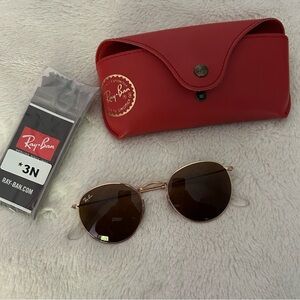 Like New Ray-Ban Round Metal Sunglasses with Orange Case, unopened polishing cloth. Customized with brown lens, gold rim, clear tips.
