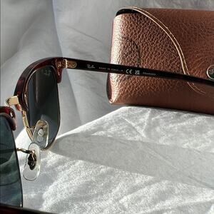 Elegant Ray-Ban sunglasses with tortoise shell frame and gold accents. Comes with a brown case. Dark lenses for a classic look.