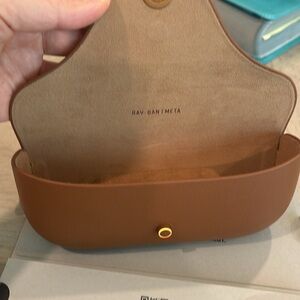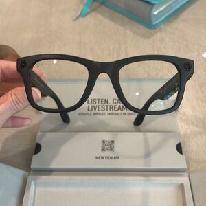 Modern black smart glasses by Ray-Ban. Includes a sleek tan case. Perfect for tech-savvy users. An icon of style from Hollywood to hip-hop, the Wayfarer never stands still. Forever embraced by the next generation of culture makers, now its journey continues with AI-enhanced wearable tech. Ray-Ban Meta Wayfarer enables you to live in the moment and share how you see the world. Listen, call, capture and livestream features are seamlessly integrated within the classic frame – so you can stay connected to the world around you. BRAND NEW NEVER WORN!! open box