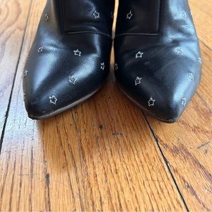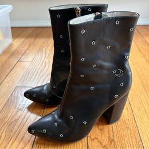 Cute embroidered booties by Raye. Star and moon embroidery on black leather. Size 6.5. Comfortable 3.75” block heel. Side zip. Very good condition, minor scuffing in heels and at tips of toes. I added sole protectors and new heel tips to the bottom of this shoe, and haven’t worn them since. So cute for spring!