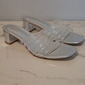 Raye Lyric Revolve Women's 9.5 Metallic Silver and Clear Strappy Heeled Sandals