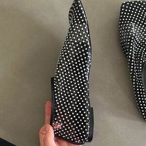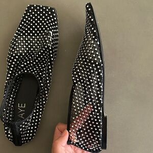 Mesh rhinestone flats similar to Christopher Esber from Revolve’s exclusive Raye line. Sheer mesh wi HR rhinestones all over and a clear plastic strap to secure foot within the shoe. Size 8 but fit me perfectly as an 8.5. Worn twice, protective wrap on sole is still intact.