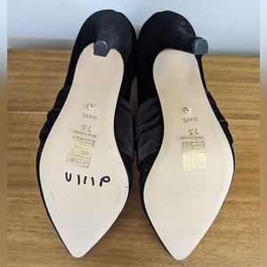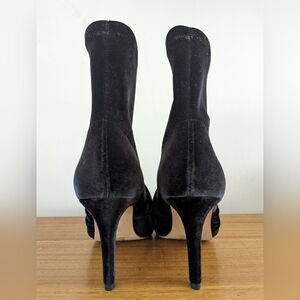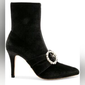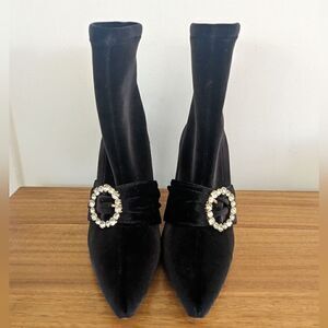 Description: Raye Bette Pointy Toe Slip-on Boot in Black Velvet, sz 7 ½ EUC, velvet textile upper with leather sole, pull on styling, crystal brooch accents, inspired by the word reina, Spanish for queen, Raye is the queen bee shoe brand that will enchant your heart and elevate your style, minimal wear on the soles, ships without box