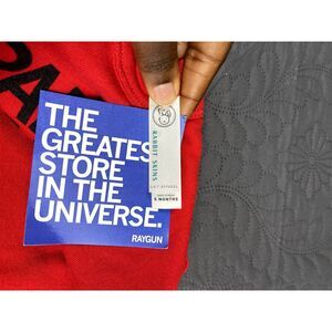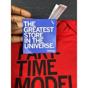 Part-Time Model. Black Screen Print on a Red Onesie (100% Baby Rib Cotton). Item will shrink an average of one size when put in the dryer. Cut and sewn sweatshop free. Designed and printed by Union Labor at RAYGUN.