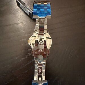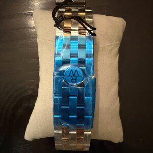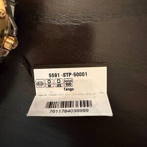 Blue dial enhanced by luminous yellow gold-tone hands. Silver-tone stainless steel case with a two-tone (silver-tone and yellow gold pvd) stainless steel band. Quartz movement. 100 meters / 330 feet water resistance. Fixed bezel. Scratch Resistant Sapphire crystal. Solid caseback. Deployment clasp. Pull / Push crown. Case size 39 mm x 7.9 mm. Band 20 mm x 8 incheslong. Raymond Weil 5591-STP-50001 Tango Watch.