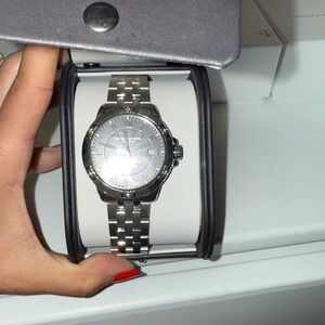 Stainless steel case with a stainless steel bracelet. Fixed stainless steel bezel. Grey dial with luminous silver-tone hands and Roman numeral hour markers. Minute markers around the outer rim. Dial Type: Analog. Luminescent hands. Date display at the 3 o'clock position. Quartz movement. Scratch resistant sapphire crystal. Screw down crown. Solid case back. Case size: 41 mm. Case thickness: 7.4 mm. Round case shape. Bracelet width: 20 mm. Fold over clasp with a push button release. Water resistant at 300 meters / 1000 feet. Functions: date, hour, minute, second. Dress watch style. Watch label: Swiss Made.