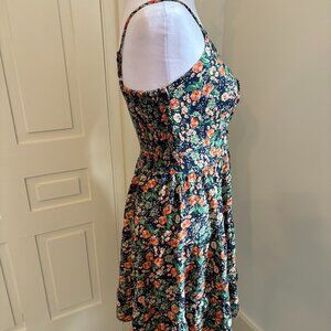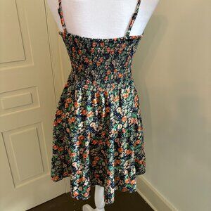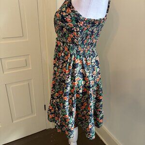 Mini sundress with adjustable spaghetti straps, V neckline dropping to a twisted bodice with keyhole cutout, smocked back bodice, and a softly gathered skirt. Fabric is a 100% Rayon floral print in shades of coral, green and white on a navy-blue background. Size Medium with measurements taken flat and unstretched: Bust at Underarms 14 1/2", Waist 13", Length from Underarm to Hemline 25 1/2". In Excellent Preowned Condition.