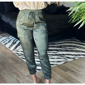 These pre-owned olive green cargo pants feature a drawstring waist and elasticized cuffs. The material appears to be a lightweight, possibly synthetic fabric with a subtle sheen. The pants have functional cargo pockets on each thigh. There are no visible brand markings. The pants show minor signs of wear, consistent with pre-owned condition, but no significant damage or stains are apparent.