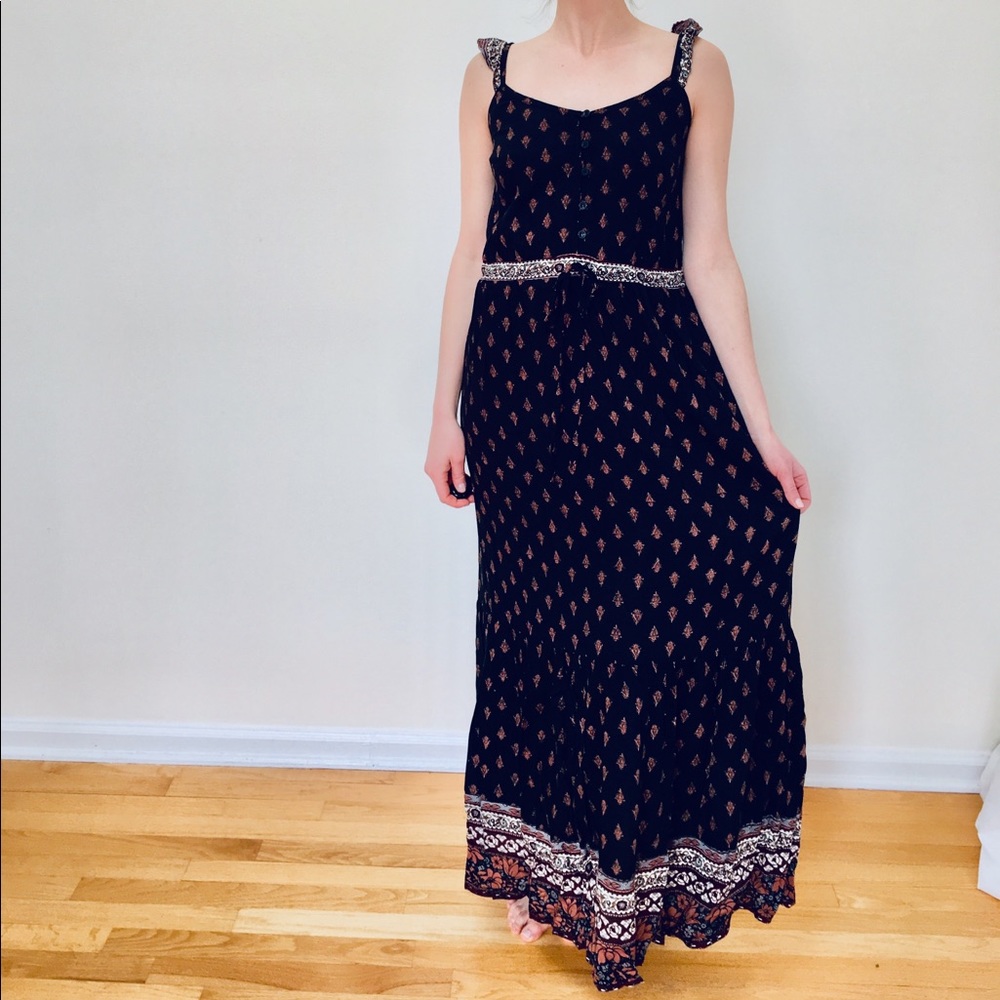 100% rayon Maxi, cinched and ties at the waist, ruffle spaghetti strap, beautiful pattern, elastic and stretchy at the top and at waist, brand new never worn, about 55" long, 16 1/2" across bust
