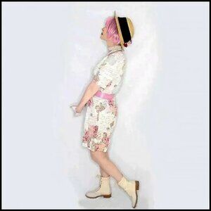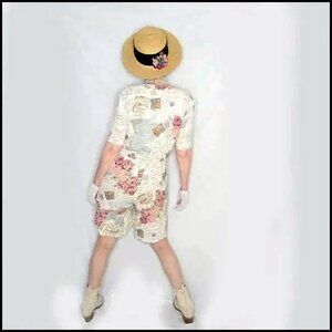 ...is easy when you flirt in a cute romper. Bring on the fun in this cute casual romper playsuit. From 1992 exactly, rayon, in a romantic pink novelty print. Short sleeves, scoop neckline, pockets, roomy hips, modest and comfy. Buttons to waist then short nylon zipper. Belt loops, no belt (belt shown not included). Small shoulder pads, some stretch in waist. CONDITION: flawless.