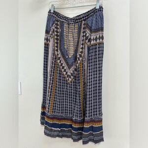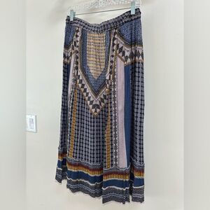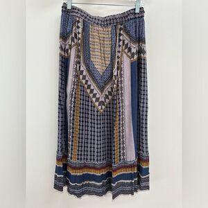 Chic geometric patterns in blue and gold. A-Line design for versatile styling. Perfect for any occasion. Very soft great condition approximately waist 15 without stretching, length 33.5
