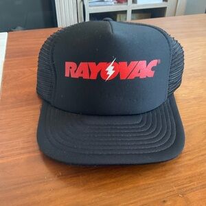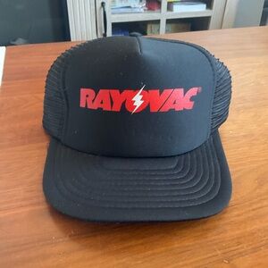 Stylish black trucker hat with bold red Rayovac logo. Perfect for casual wear.