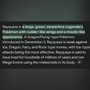 Rayquaza is a Pokémon character with serpentine features. He has a rudder like wings and a missile like appearance.