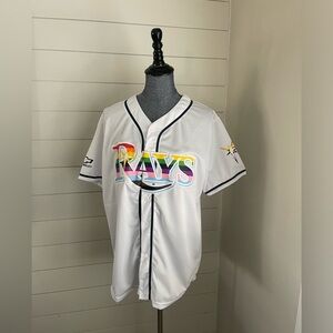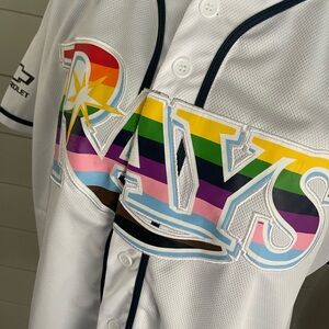 Show your support with the Rays men's jersey, featuring a stylish white and blue design. Perfect for fans and casual wear alike.