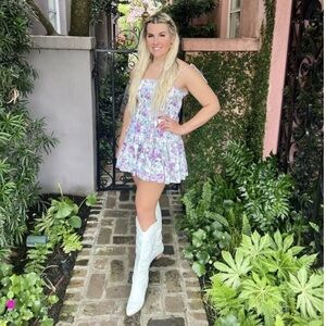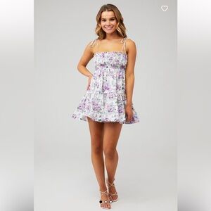 Charming floral mini dress with tiered design. Features adjustable straps and a playful pattern.