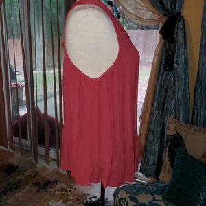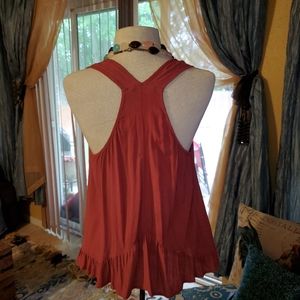 Adorable ruffled Tunic with Razor back. Sz. LG. But could def. Fit a Med. As well. Pit to hem 13". 100% Rayon Fabric in Burnt Copper color. Great Condition!