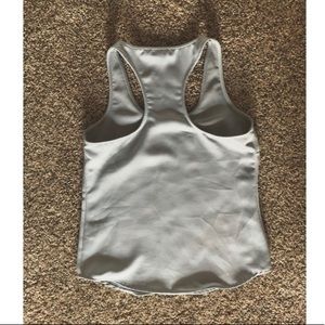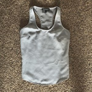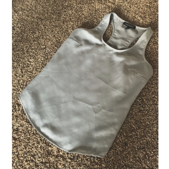 Grey silk like razor back. Will iron if purchased. Great condition. Nice blouse for under and blazer. Not fitted, little boxy.