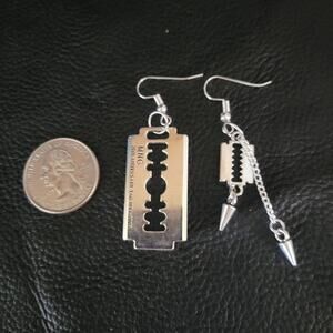Razor blade and spikes handmade hypoallergenic hook silver tone dangle earrings