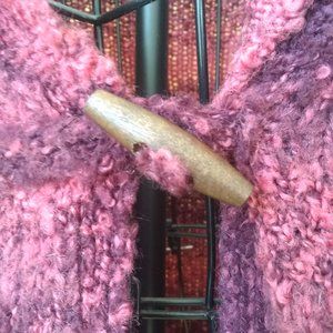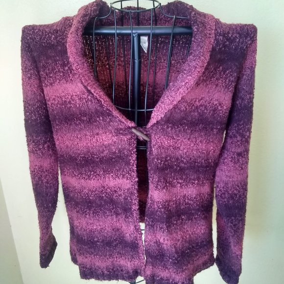 Style-Cozy - Sweater-Classy look- slight cowl neck- long sleeves- Toggle button with loop- Knit fabric Wool and Acrylic blend -Color wine and berry ombre colored stripes- Condition like new! Size L. Style tip would look classy with the sleeves cuffed up and pared with tall boots. Thanks for shopping happy poshing!