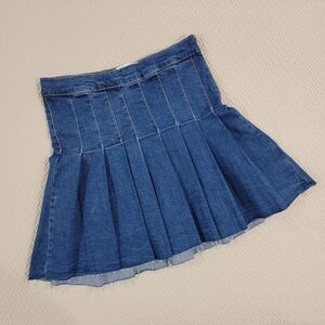 Blue denim pleated skirt. Drop waist. Raw edge hemline. School girl / skater retro Y2K style skirt.