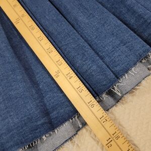 Blue denim pleated skirt. Drop waist. Raw edge hemline. School girl / skater retro Y2K style skirt.