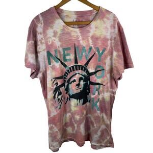 Re-loved tie dye shirt. Ice tie dye in good condition with no rips, holes, or pilling. Tie dye shirt with Statue of Liberty decal. Short sleeve shirt, short sleeve top. Size XL, Size 1X, Size Extra Large.