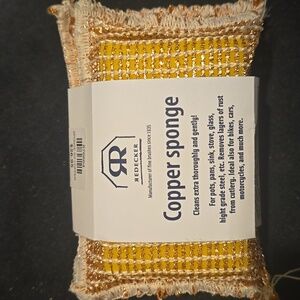 Experience superior cleaning with the Copper Sponge. Perfect for pots, pans, and more, this orange and white sponge gently removes dirt without scratching surfaces.