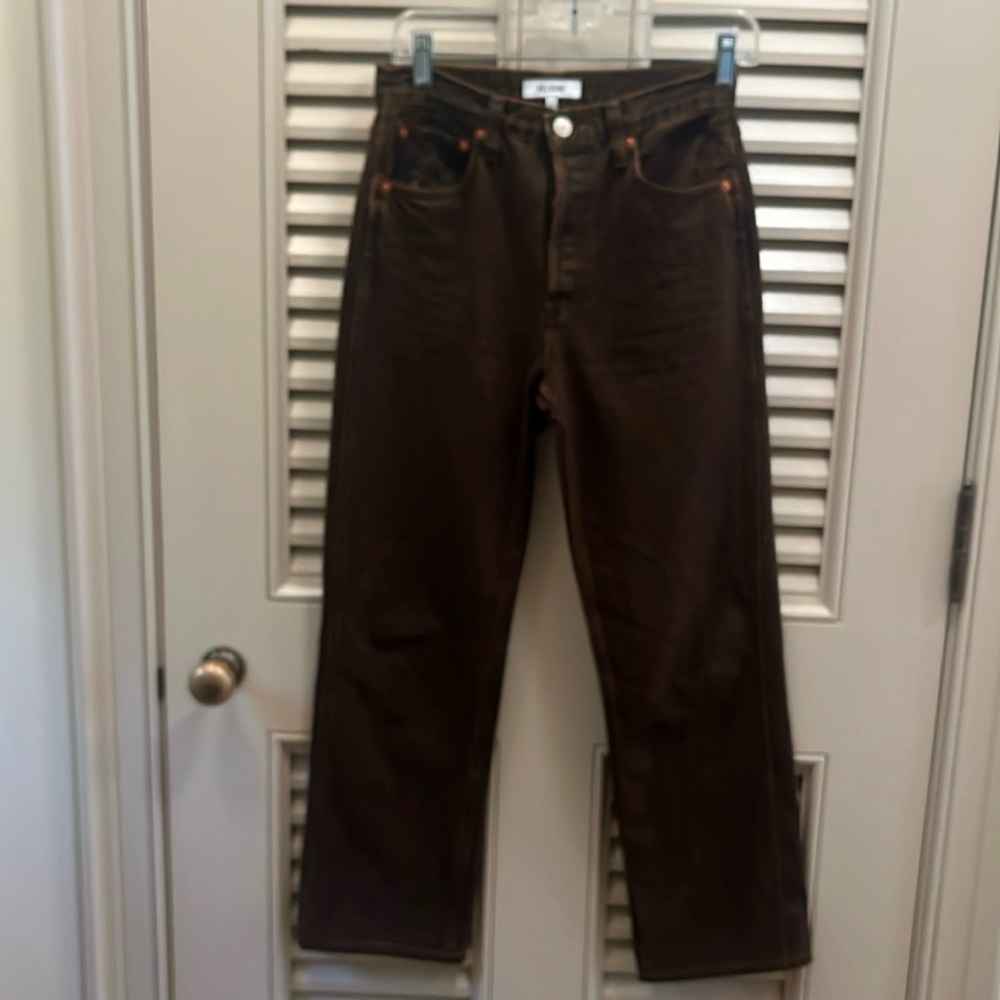 Wide Leg Jeans. Color: Terracotta Dipped, sort of a dark bronze. Buttons on zipper area. Waist 14”. Inseam 28”