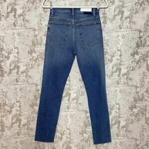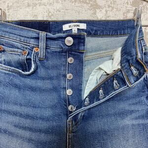 Fantastic jeans from Re/Done! Features high rise waist, button fly, "Comfort Stretch" denim fabric, medium classic blue wash named "Dusk Destroy", slim skinny leg silhouette, ankle length inseam, ripped knee details, and raw edge hem on the legs. At the time of listing, this style and color is still sold on the brand's website.