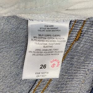 Fantastic jeans from Re/Done! Features high rise waist, button fly, "Comfort Stretch" denim fabric, medium classic blue wash named "Dusk Destroy", slim skinny leg silhouette, ankle length inseam, ripped knee details, and raw edge hem on the legs. At the time of listing, this style and color is still sold on the brand's website.
